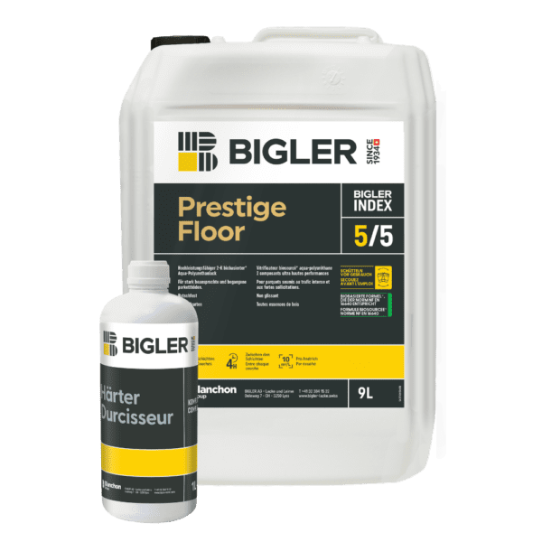Prestige Floor ist ein zweikomponentiger, biobasierter* Parkettlack auf Polyurethanbasis. Er besteht zu 70 % aus natürlichen, mineralischen und biobasierten Inhaltsstoffen (nicht aus biologischem Anbau), darunter 21 % biobasierter Kohlenstoff gemäß NF EN 16640. Dank seiner hervorragenden Eigenschaften eignet sich Prestige Floor besonders gut für stark frequentierte und beanspruchte öffentliche Bereiche. Prestige Floor ist in den Oberflächen matt, seidenmatt und Extreme matt erhältlich.